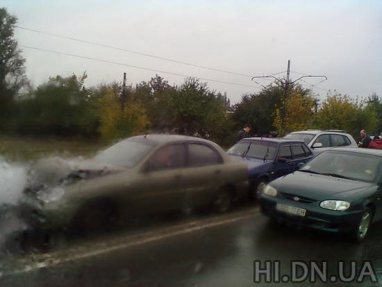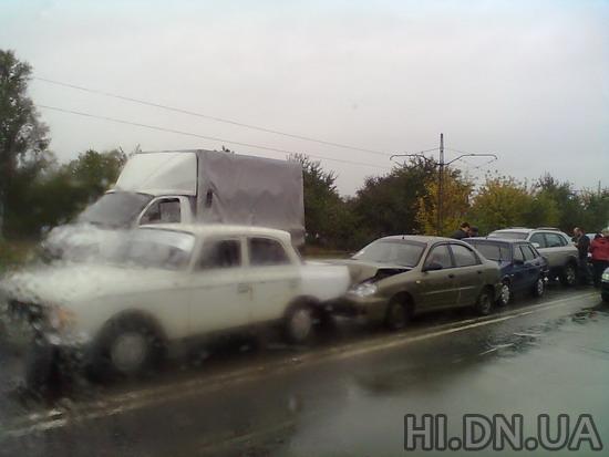 Первым оказался белый «Москвич», который, видимо, собирался поворачивать на заправку, но притормозил по неизвестной причине. В него врезался «Ланос» который, возможно, не выдержал дистанцию, ему в зад въехала 99-тка и последним зазевался водитель «Рено».
