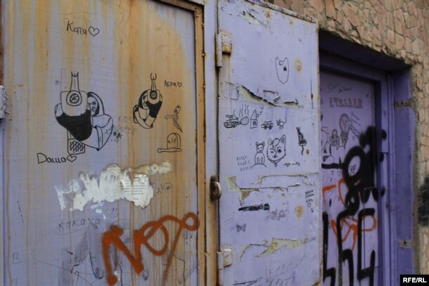 Запасная дверь подъезда, где живет предполагаемый живодер, исписана граффити. Здесь рядом с рисунками котят имена женщин и монстры с оружием. Очевидно, мужчина срывал на животных обиду от неразделенных чувств к девушкам.