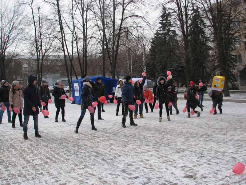 Около 30 студентов, с ленточками – символами солидарности с ВИЧ-положительными людьми и с живущими со СПИДом пели, танцевали, раздавали прохожим шарики, убеждали толерантно относится к людям, зараженным ВИЧ-инфекцией.