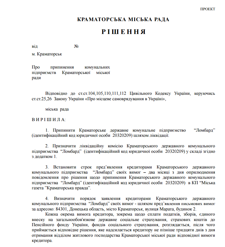 В Краматорске ликвидируют КП "Ломбард" и КП "Архитектура и кадастр"