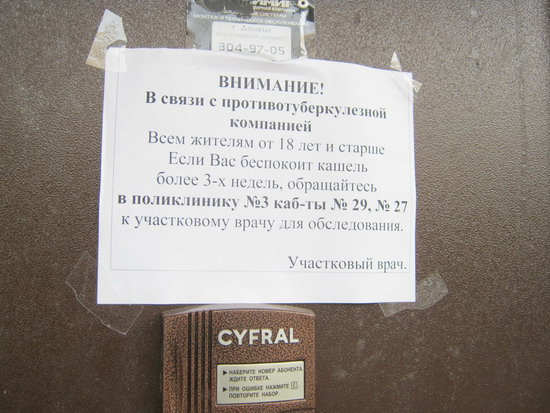 «В связи с противотуберкулезной компанией, все жители от 18 лет и старше, если вас беспокоит кашель более трех недель, обратитесь в поликлинику № 3 к участковому врачу для обследования».