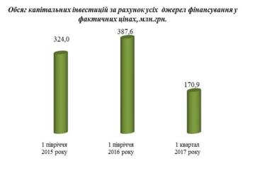 Объем капитальных инвестиций за счет всех источников финансирования за первое полугодие 2017 г. составил 170,932 млн.грн.