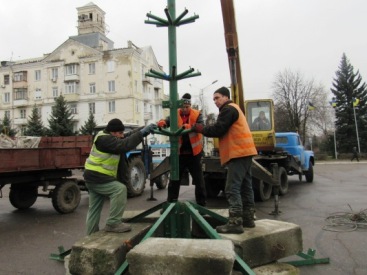 На центральной площади Краматорска работники УРСАС приступили к монтированию главной новогодней елки города. - сообщает "Восточный проект"