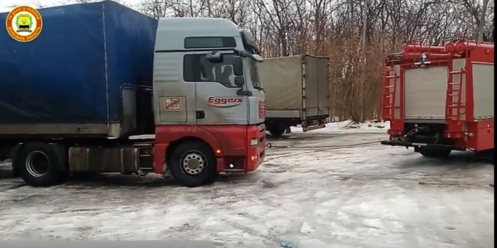Спасатели 12-го Государственного пожарно-спасательного отряда Главного управления ГСЧС Украины в Донецкой области, прибывшие на место происшествия, с помощью автоцистерны и буксировочного троса отбуксировали 6 грузовых автомобиля на проезжую часть.