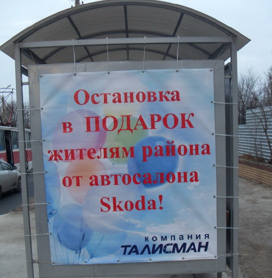 Действительно, эта остановка досталась жителям в подарок от автосалона Skoda. Побольше бы таких подарков!