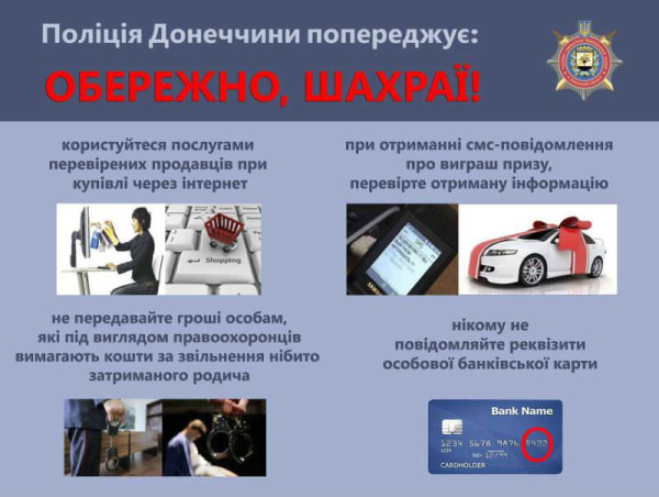 С начала этого года открыто 64 уголовных производств по ст. 190 “Мошенничество” Уголовного кодекса Украины. Среди распространенных видов преступления остаются покупка через Интернет, операции с банковскими картами и счетами, а также спасение близких родственников от тюрьмы, – сообщает Краматорский отдел полиции.