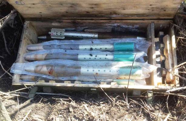 О подозрительных предметах в направлении «серой зоны» пограничникам во время несения службы сообщили местные жители. Группа реагирования от пограничного отряда проверила указанное место и обнаружила в 300 метрах от КПВВ в лесопосадке схрон боеприпасов.