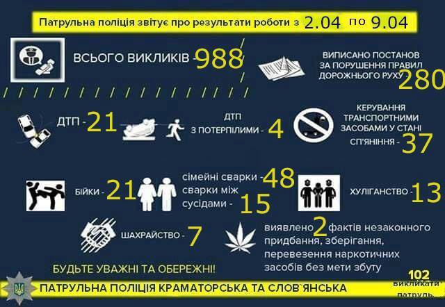 Согласно информации правоохранителей, с 2 по 9 апреля в Краматорске и Славянске было 988 вызов правоохранителей, что на 204 больше, чем неделей ранее. За неделю произошло 21 ДТП (на прошлой неделе – 12), в том числе четыре с потерпевшими. В состоянии алкогольного опьянения выявлено 37 водителей (22). За нарушение ПДД выписано 280 протоколов (380).