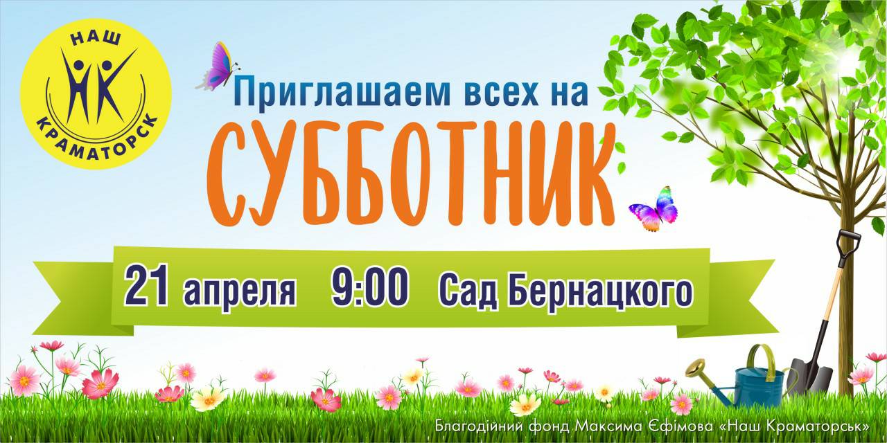 Общественная организация «Наш Краматорск» приглашает всех на субботник 21 апреля, в 9.00, в Сад Бернацкого; 28 апреля, в 9.00 - в парк Пушкина.