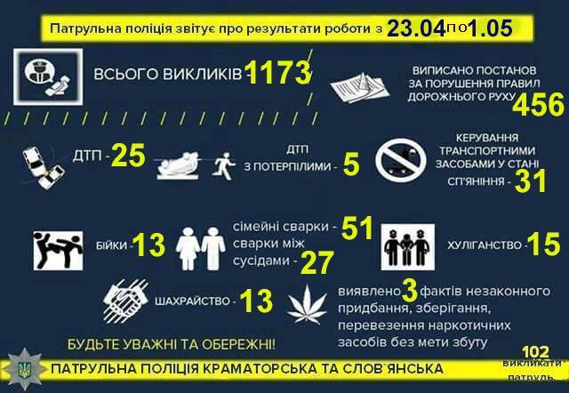 Согласно информации правоохранителей, с 23 апреля по 1 мая в Краматорске и Славянске было 1173 вызов правоохранителей, что на 285 больше, чем неделей ранее. За неделю произошло 25 ДТП (на прошлой неделе – 14), в том числе 5 (3) с потерпевшими. В состоянии алкогольного опьянения выявлено 31 водителей (21). За нарушение ПДД выписано 456 протоколов (427).