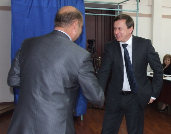 Александр Гончаренко (справа) получает депутатский значок из рук мэра. Депутатское кресло обошлось ему дороже, чем Геннадию Костюкову - мэрское