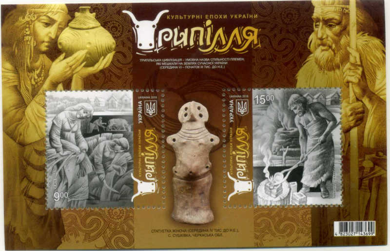 Серия: Культурные эпохи Украины. Триполье. Почтовый блок № 157 « Триполье. Культурные эпохи Украины» из 2-х марок: № 1635 “Земледелие”, № 1636 “Литейное дело”. Формат блока – 131х83,5 мм. Формат каждой марки – 40х40 мм. Номинал марки № 1635 – 9 грн. Номинал марки № 1636 – 15,00 грн. Тираж блока – 30 тыс. экз. Автор блока – Сергей Харук и Александр Харук. Блок многоцветный. Способ печати – офсет. Напечатан на ПП «Полиграфический комбинат «Украина».