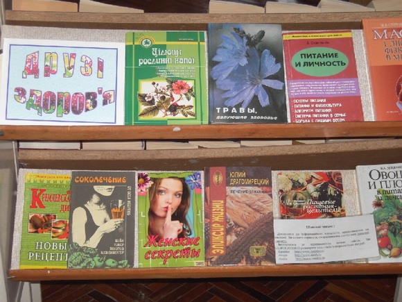 На сегодняшний день в библиотеке представлен подраздел цикла «Перемагаємо недугу, утверджуємо и звеличуємо себе». Выставка посвящена проблемам здорового образа жизни. На стендах представлены книги о фитнесе, правильном питании, различных диетах, методах траволечения и способах закаливания.
