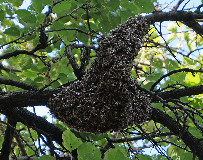 Утром 4 июня такой рой плавно переселился на дерево возле пятиэтажки, разместившись прямо над ларьком "Мороженое". Интересно, что здешний продавец относится к такому соседству с железным хладнокровием, заявив, что "если их не дразнить - они никого не покусают".