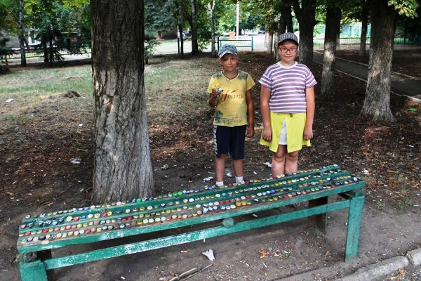Артём и Соня нашли себе занятие. Собирают по скверу пробки из-под бутылок и выкладывают на лавочку – творят. Одну украсили и принялись за вторую. И, главное, материал для творчества под рукой и недостатка в нём нет… А скорее – избыток… Проникся я их творчеством… Отсюда и пост.