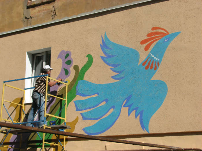 Мурал на одном из домов по ул. Ярослава Мудрого рисует художник Сергей Лаушкин