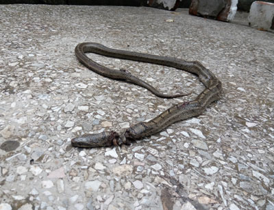 - Вот такие гады ползают у нас в Красногорке, - рассказывает Светлана Петровна. – Наша улица Новая Заря расположена недалеко от кладбища. Всюду норы, всюду – змеи. Эту змею убила моя соседка, это уже вторая за неделю. Я принесла змею, чтобы узнать у специалистов, стоит ли нам бояться или нет. Может, это и не ядовитые змеи, так зачем же их трогать? А, может, это гадюки?