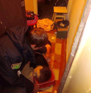 На втором этаже в одной из квартир патрульные заметили открытую дверь, на пороге которой лежал ребенок в едва живом состоянии и со спины у которого стекала кровь, а рядом - женщину. Увидев сотрудников полиции, 42-летняя гражданка начала неадекватно агрессивно себя вести и пыталась бросаться на стражей порядка.
