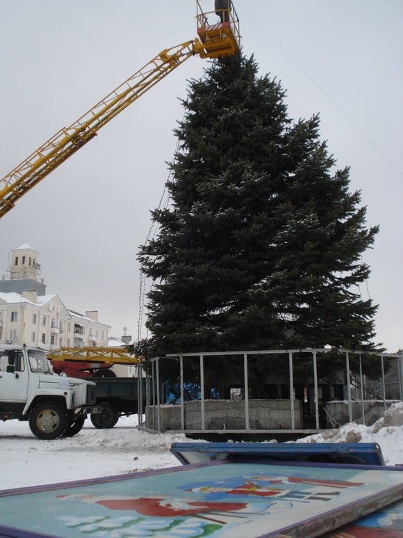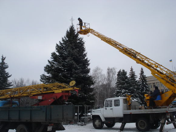 На центральной площади Краматорска начали наряжать главную елку города. На вершине дерева уже появилась белая звезда. Наряжающие приступили к сбору гирлянды.