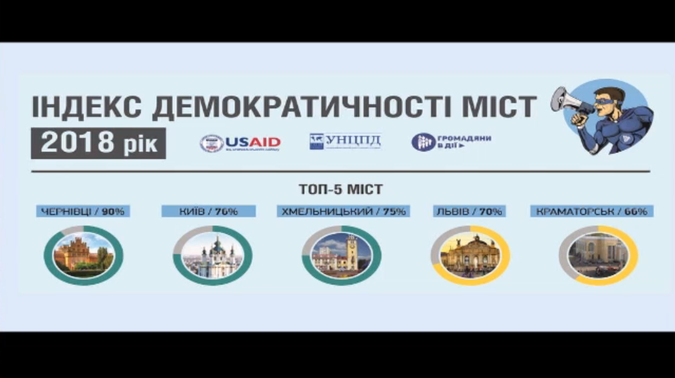 Города, которые набрали наиболее высокий показатель индекса демократичности: Черновцы - 90%, Киев - 76%, Хмельницкий - 75%, Львов - 70% и Краматорск - 66%. Самый же низкий индекс у Харькова – 38% и Житомира - 29%.