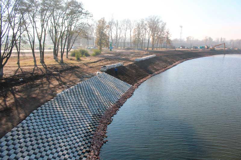 В саду Бернацкого продолжается строительство набережной реки Торец, уже спланирована территория, вывезен грунт после расчистки реки, от моста вдоль реки Торец началась укладка бетонных блоков в шахматном порядке, которые укладываются на водонепроницаемую пленку, межу блоками будет засыпаться щебенка, декоративным камнем засыпаются места входа блоков в реку.