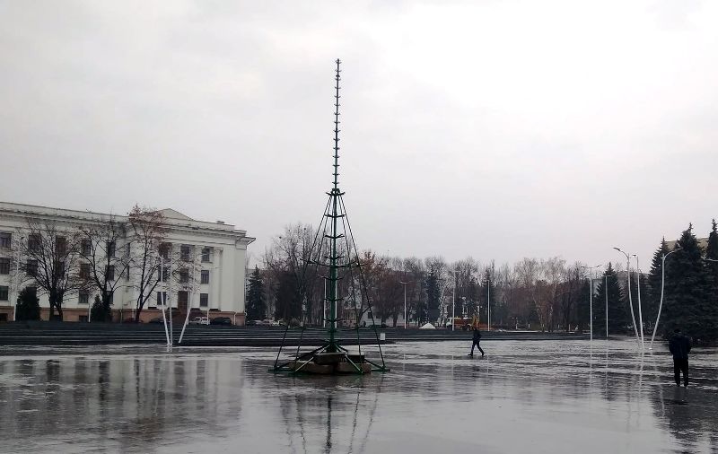 На центральной площади Краматорска начали устанавливать новогоднюю елку