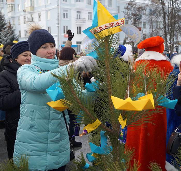 Сегодня, 29 декабря.на центральной площади Краматорска проходит парад Новогодних елок, которые украшены учениками городских школ. Один из экспонатов, представленный ОШ № 8 - интерактивный: каждый желающий может украсить хвойное деревце желтыми и голубыми бумажными корабликами, которые символизируют солидарность с украинскими военными моряками, захваченными в плен российской военщиной 25 ноября нынешнего года.