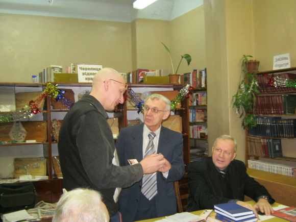 Удостоверения и значки Национального Союза краеведов Украины нескольким краеведам вручил присутствующий на заседании председатель Донецкой областной организации краеведов Валерий Романько. Удостоверение и значок получил краевед из Краматорска Виктор Иванов, Виктор Мамонтов из Дружковки, Александр Рогов из Славянска и Виктор Новосельский из Константиновки.