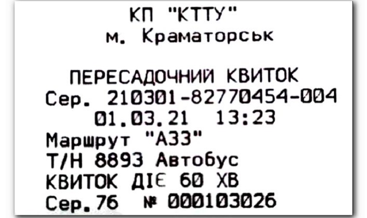 Пересадочный билет печатается на POS-терминале автоматизированной системы оплаты проезда, которая внедрена в коммунальном транспорте Краматорска. На пересадочном билете указаны дата, время, № маршрута и № машины.
