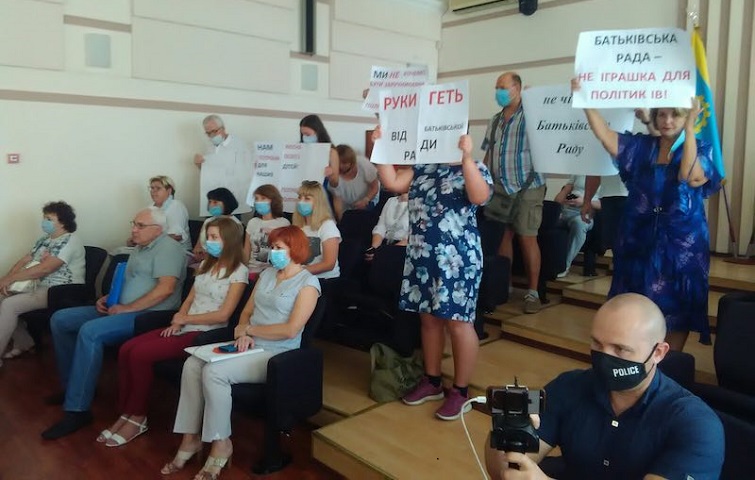 Около десяти человек держали плакаты с надписями: “Руки геть від Батьківської Ради!”, “Не чіпайте Батьківську Раду!”, “Ми не хочемо бути заручниками брудних політичних ігор” и другими. Таким образом они протестовали против возможной попытки депутатов отменить решение исполкома о создании Батькивськой Рады.