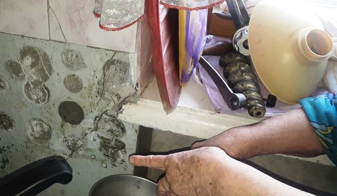 Одна из жительниц, одинокая пенсионерка, показала свою квартиру. В ванной комнате из-за трещин на стенах отпала вся плитка. Стена между ванной и кухней отходит, оставляя зияющую щель. Но самое страшное для женщины, это трещины под окнами. «Я зимой подкладываю подушку, потому что дует морозный воздух из дыр. Как вы думаете, нам кто-то сможет помочь?», - задает риторический вопрос женщина.