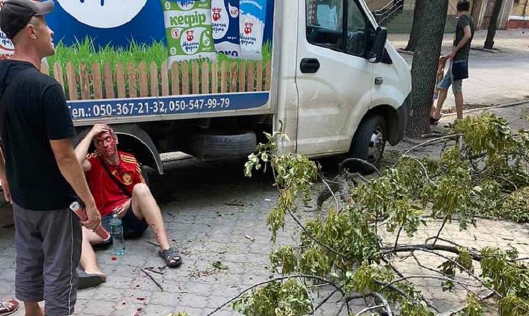 На фото видно, как молодого человека усадили в тенек ближе к припаркованному автомобилю, и он истекает кровью.