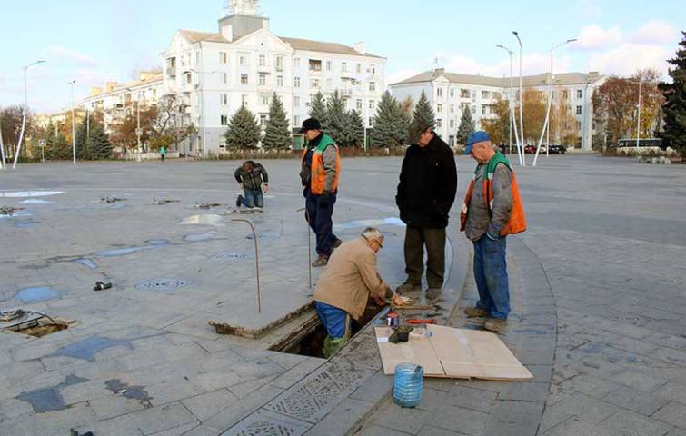 Коммунальные службы вскрыли ниши под освещение и слив воды, чистят форсунки и фильтры для очистки воды, сливают воду из системы.