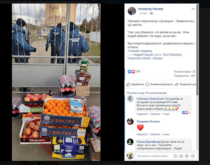 "Приехали переселенцы из Донецка. Привезли все, что смогли, - пишет репортер, и передает их слова: "Нас уже обвиняли, что война из-за нас. Этих людей обвинят, что вирус из-за них".