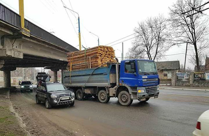 Водитель грузовика, двигаясь под мостом путепровода, не рассчитал высотные габариты груза, в результате чего произошел обрыв поперечной растяжки контактной троллейбусной сети.