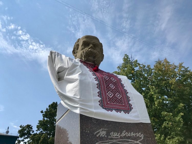 В Краматорске памятник Т. Г. Шевченко, который установлен возле городского совета, одет в традиционную вышиванку.