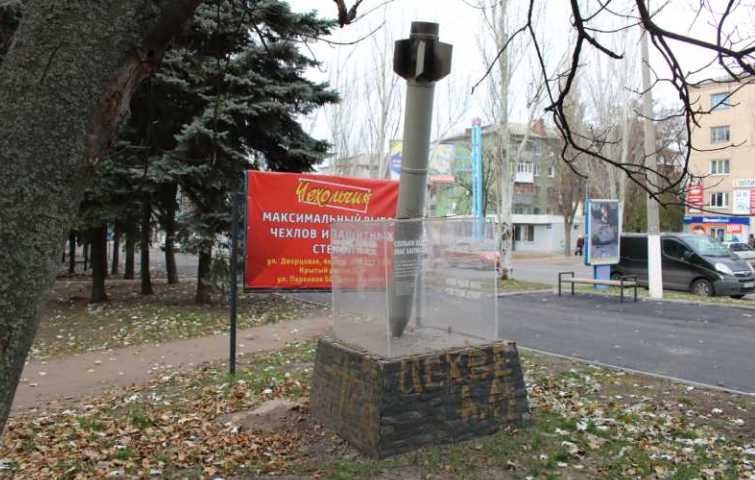 Мемориал, представляет из себя снаряд, который прилетел в город 10.02.2015 года и стеклянный куб с именами жертв обстрела и надписью “Сколько людей еще должно погибнуть”.