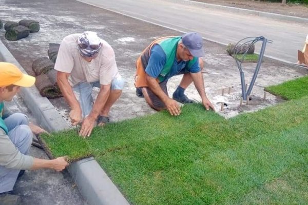 На дорожке к флагштоку в парке "Юбилейный" укладывают газон