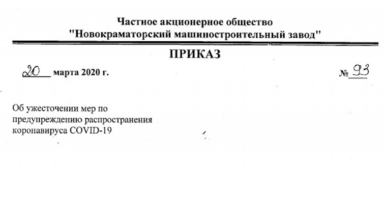 Генеральный директор ЧАО НКМЗ своим приказом от 20 марта распорядился для предотвращения распространения COVID-19 среди работников предприятия заблокировать карточки-пропуска тех, кто по состоянию на 20 марта находятся в ежегодных отпусках 5 и более дней, начиная с 11 марта включительно.