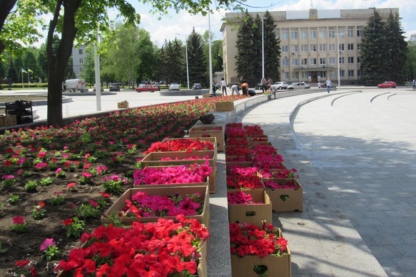 На площади Мира в Краматорске высаживают петунии: счет идет на тысячи