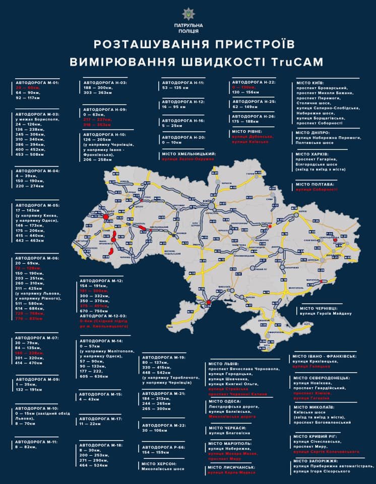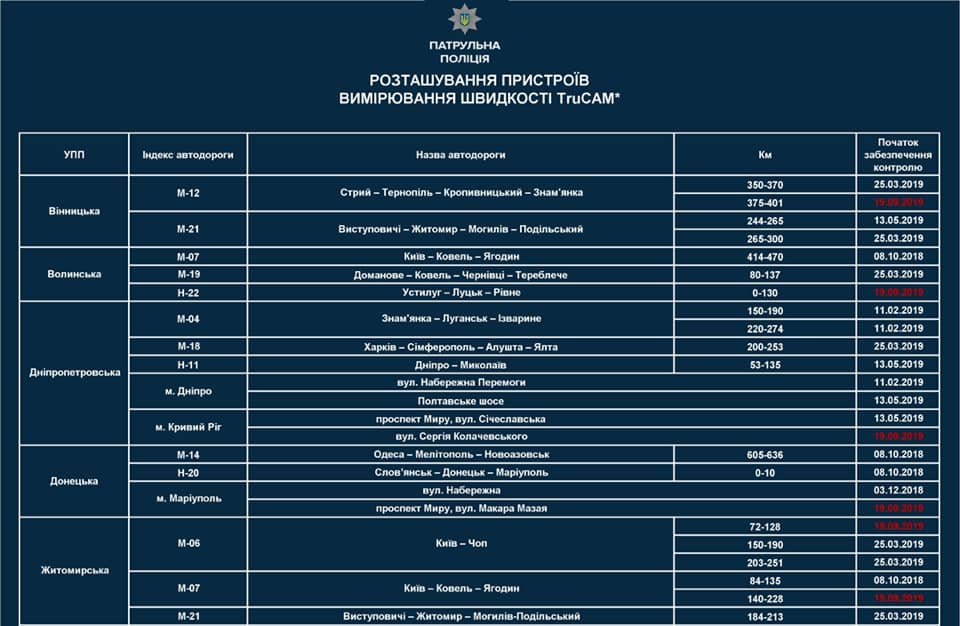 На трасі між Слов’янськом і Краматорськом з грудня минулого року почали використовувати камери вимірювання швидкості TruCAM. З 19 вересня на дорогах України додається 17 нових та буде розширено 8 існуючих ділянок автодоріг (з підвищеним рівнем аварійності), на яких здійснюватиметься контроль швидкісного режиму за допомогою лазерних вимірювачів швидкості TruCAM.