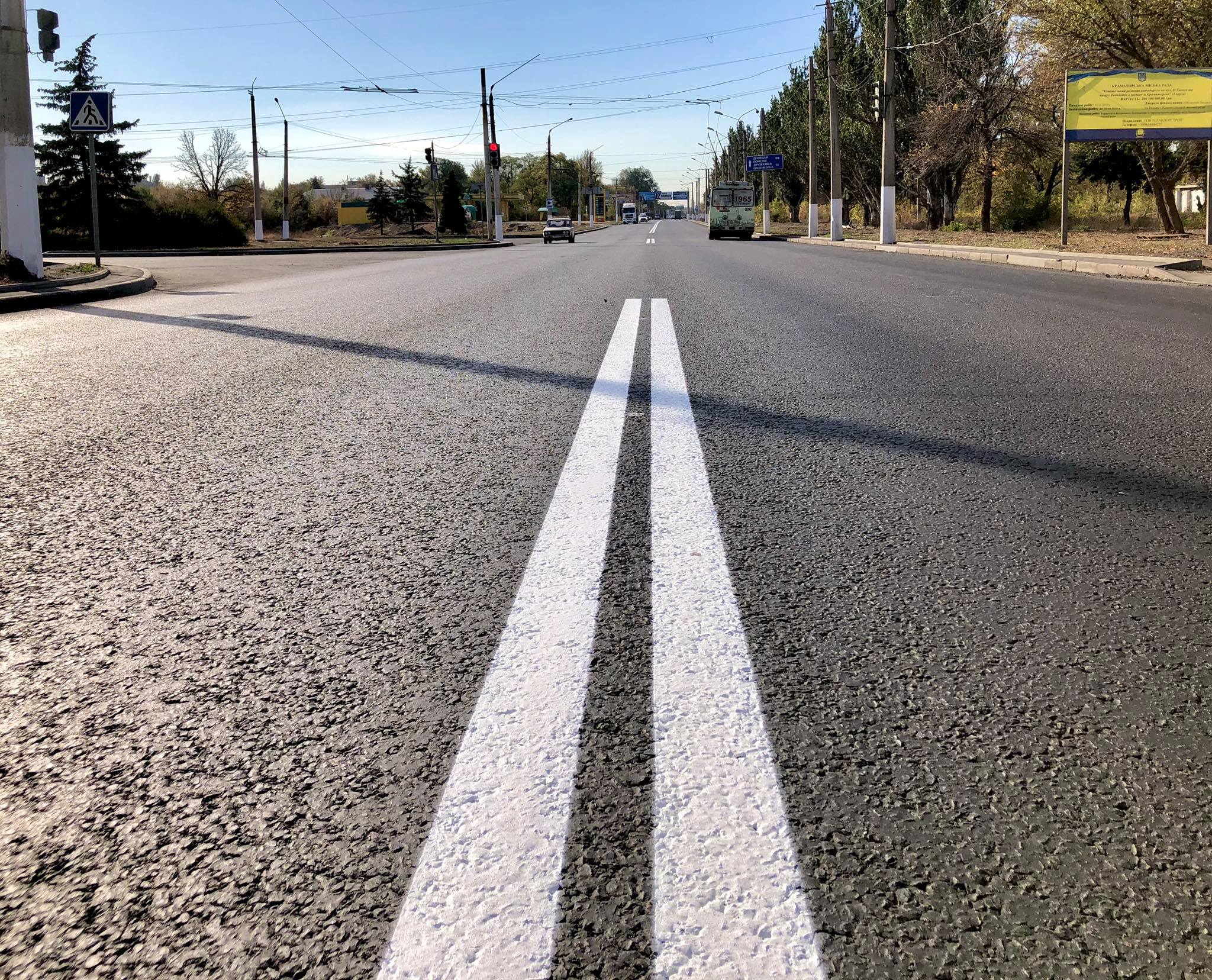 Работы по нанесению разметки по ул. О. Тихого выполняются на участке со стороны Славянска. На дороге появились двойные сплошные линии и зебра на пешеходных переходах.