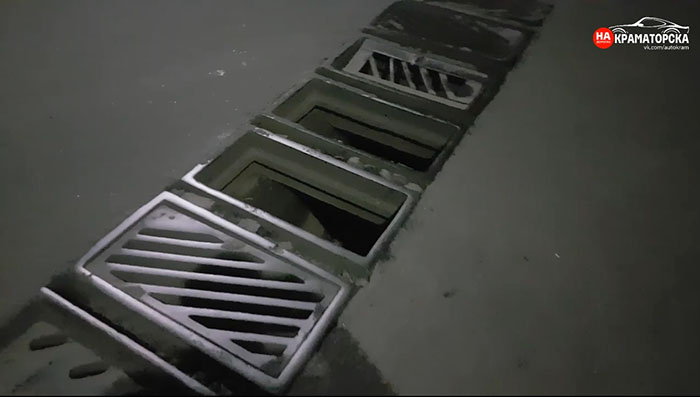 Куда делись решетки ливневки - не известно, есть основания полагать, что их попросту украли.