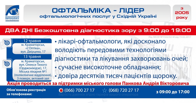 Медицинский центр "Офтальмика" - лидер офтальмологических услуг в восточной Украине с 2005г. приглашает жителей Краматорска на бесплатную диагностику зрения.