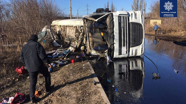 В Краматорске перевернулся грузовик с топливом.