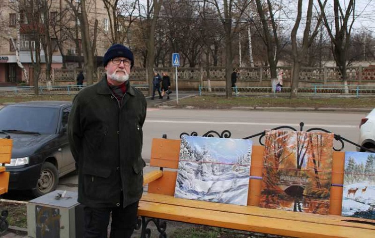 Художник демонстрирует свои картины на лавочке возле магазина “Цитрус” по ул. Дворцовой, а иногда и возле магазина “Сільпо” на бульваре Краматорском.