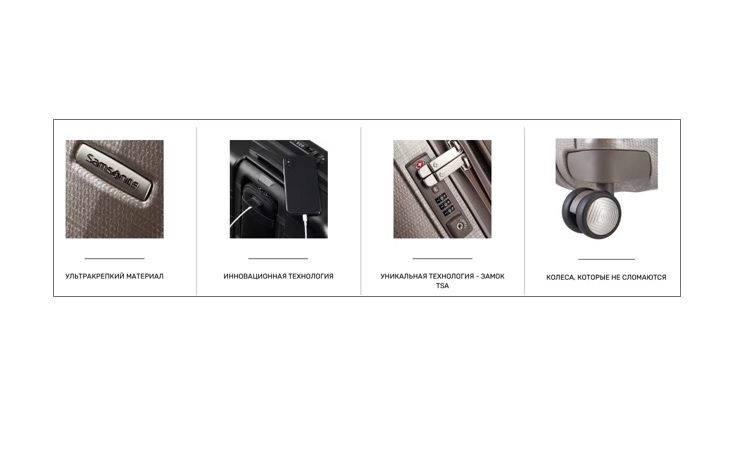 Samsonite внедрила немало инновационных решений: алюминиевый «дипломат» Бонда, встроенный кодовый замок, 4 ведущих колеса, незамерзающий сверхлегкий плетеный полипропилен, экоматериалы из переработанного пластика – это только отдельные штрихи в истории бренда.