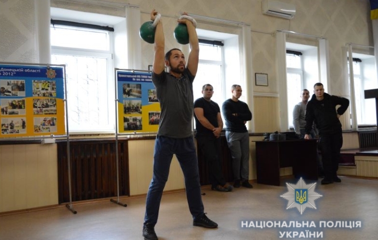 По окончании занятий между сильнейшими сотрудниками полиции Краматорска и Дружковки прошел отборочный этап соревнований по гиревому спорту. Ребята должны были показать лучшие результаты в упражнении рывок гирь с двух рук, каждая из которых весит 24 килограмма, и толчок гири.