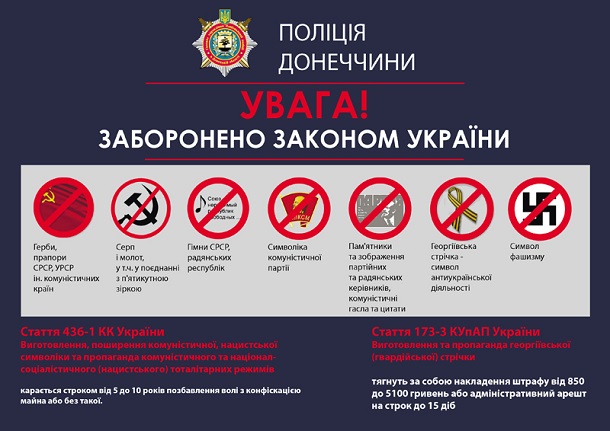 Полиция напоминает, что согласно ч. 1 ст. 4 Закона Украины «Об осуждении коммунистического и национал-социалистического (нацистского) тоталитарных режимов в Украине и запрет пропаганды их символики» запрещено изготовление, распространение, а также публичное использование символики коммунистического тоталитарного режима, символики национал-социалистического (нацистского) тоталитарного режима, в том числе в виде сувенирной продукции.