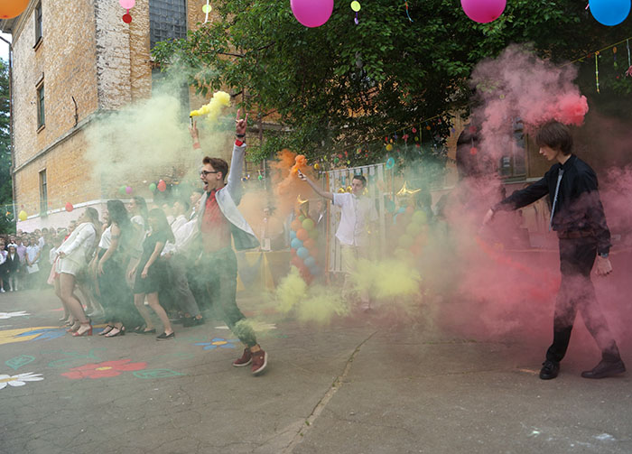 Во-первых, прощальное выступление учеников 11-а класса здесь нежданно-негаданно превратилось в дымно-огненное шоу, которое все собравшиеся поколения встретили восторженным писком и шумом.